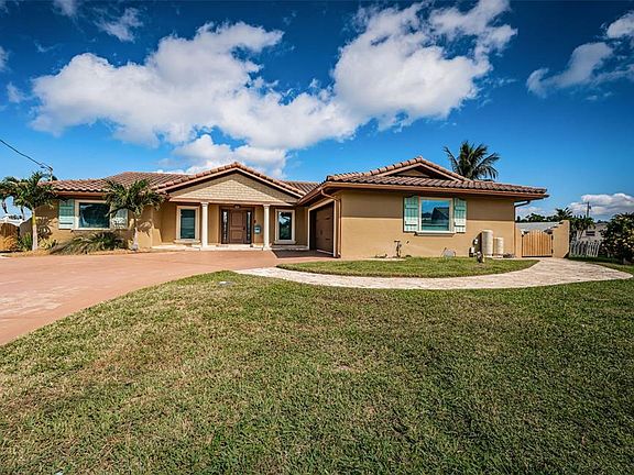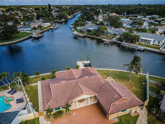 Under contract-accepting backup offers. BEAUTIFUL, HIGH-QUALITY LUXURY FINISHES THROUGHOUT THIS EXCEPTIONAL 3 BEDROOM RESIDENCE LOCATED ON AN IMPRESSIVE 160+ FT OF WATER FRONTAGE! Situated at the end of a quiet cul de sac, an attractive covered entry introduces impressive scalloped-edge travertine marble floors, exceptional wood finishes, radiant lighting, and superb interior and exterior trimwork around doors and windows. The elegant kitchen boasts lavish zebra wood cabinetry, eye-catching granite counters, fine SS appliances, lovely tile backsplash, large multi-level island bar and separately – a gorgeous entertainment drybar with wine chiller. Your large central living area transitions to a terrific multi-purpose family/dining room overlooking the waterfront. The exceptional owner’s suite enjoys private access to the waterfront, a sizable walk-in closet with closet system and a luxurious bath with resplendent dual vanities, striking tilework, and a dazzling custom glass-enclosed multi-head rainshower. 2nd and 3rd bedrooms enjoy a rich, inviting allure and are serviced by a gorgeous guest bath with a plush vanity and a stunning glass-enclosed travertine shower. Out back you’ll discover a large travertine paver deck, a composite dock with attached floating dock, a private outdoor shower complemented by a powder bath, and three distinct areas for family and guests. Back yard area provides ample room for a swimming pool/spa (see renditions). Indoor laundry, large 2-car garage with superior epoxy flooring and so much more. This is a great value in an excellent protected boating location, close to highly-rated schools, shopping and dining! Dimensions are estimates, buyer to verify.