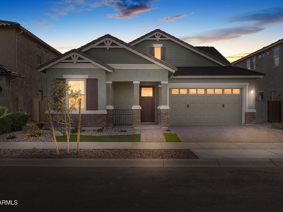 Welcome to the fantastic Cooley Station community in Gilbert! This beautifully updated, energy-efficient home features 3 bedrooms, a separated open den and 2.5 bath. Charming curb appeal with artificial turf, stacked stone accents, and a covered front porch. Inside, you'll be greeted by an open floor plan with a neutral color scheme, plenty of natural light, and tile floors throughout The great room, dining area, and kitchen seamlessly flow together, and the expansive atrium sliding glass door allows you to extend the living spaces outside, making this a wonderful floorplan for everyday living and entertaining. Gourmet kitchen featuring upgrade 42'' cabinets, upgraded hardware, granite counters, subway tile Move in with knowing this home comes with a full builder warranty. This home shows like a dream.