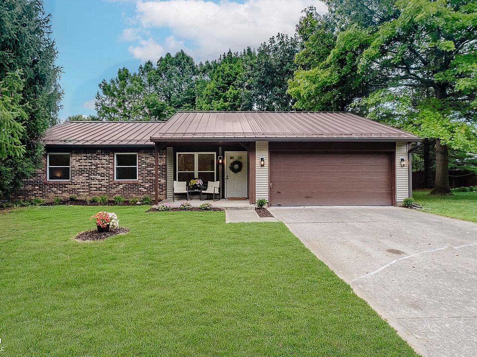 Remodeled, fresh, & move-in ready, this 3 BR/2BA Brownsburg ranch home on .35 acre has a covered front porch, 2-car garage, private & fenced backyard w/ mature trees, back patio, & storage shed - No HOA. Metal roof installed 2019. UPDATED 2025: New Flooring throughout (laminate wood in living spaces, carpet in BRs, LVT in BAs); New Paint throughout; Kitchen - New quartz countertops, ceramic zellige tile backsplash, light fixtures, sink & faucet, garbage disposal, appliances (new in 2022) including a gas range; Baths - New vanities, faucets (Delta), light fixtures, & mirrors. Home Warranty transferable to Buyer. Cozy charm of an established property combined w/ modern updates; floor plan has 2 living spaces, providing flexibility for your personal needs - options for formal dining or living room, great room/eat-in kitchen combo, etc. Incredible Lot! The backyard features sun & shade areas, garden beds ready for fall planting, fire pit area, the list goes on! Located near schools, retail, and walking distance to popular Williams Park. Check out interactive virtual tour linked in listing for highlight video!