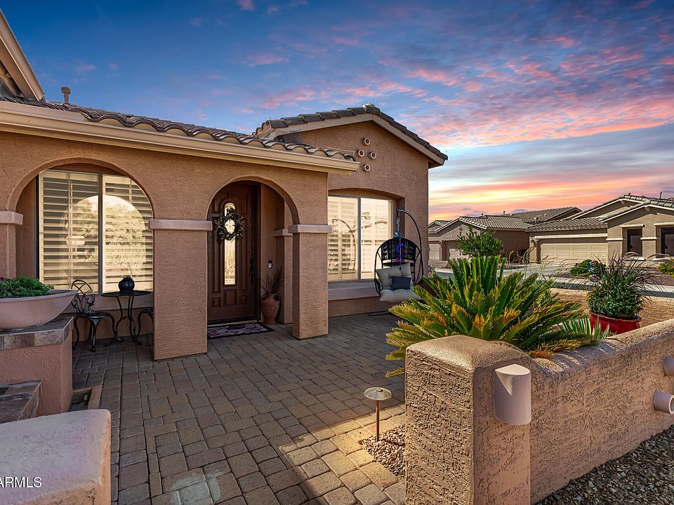This home is the epitome of tranquility...a place where you can escape the bustle of the outside world and immerse yourself in retirement. Spectacular home looks like a model that has been loaded with custom upgrades. Ideal corner lot with fantastic curb appeal including a welcoming courtyard with charming pavers and a tranquil fountain. Popular Gardenia floor plan includes expansive 10' ceilings, 8' doors, coffered ceilings, formal dining room, generous hall closets and additional office with double doors and a built in desk. Gourmet kitchen features 42'' Hickory cabinets with pull out shelves, large center island, granite counters and backsplash, gas cooktop, new Bosch dishwasher (2024) and a large walk in pantry. Luxurious primary suite with a curved wall of windows, French door... for direct patio access and an en suite bathroom complete with a spacious shower, soaking tub and a huge walk in closet. Additional upgrades include 4" plantation shutters throughout, storm door, solar screens, Kinetico whole house water system, 20' porcelain tiles throughout (no carpet), a new water heater (2025), smart garage door opener (2024), ceiling fans and 2 newer A/C units both replaced in 2022. Backyard oasis is perfect for entertaining your friends and family... extended covered paver patio featuring a spa like fountain, built in BBQ island and gas fire pit. Relax and enjoy the gorgeous landscaping complete with a newer drip irrigation system. Spacious garage includes plenty of storage space with a 6' extension large enough for a golf cart, epoxy floors and cabinets. The award winning community of Province is a gated, 24 hour guarded, active adult community with over 5 miles of WALKING paths, lakes, town center for meetings, socializing, dancing, sewing, painting, clubs, endless planned events, workout room, card games. Indoor and outdoor pools & spas to keep you cool during the summer! Did we mention PICKLEBALL? Province proudly sports 9 beautiful, lighted and dedicated pickleball courts. Don't miss out on this incredible property and start living the GOOD LIFE! Please note all appliances are included and furnishings are available on a separate bill of sale.