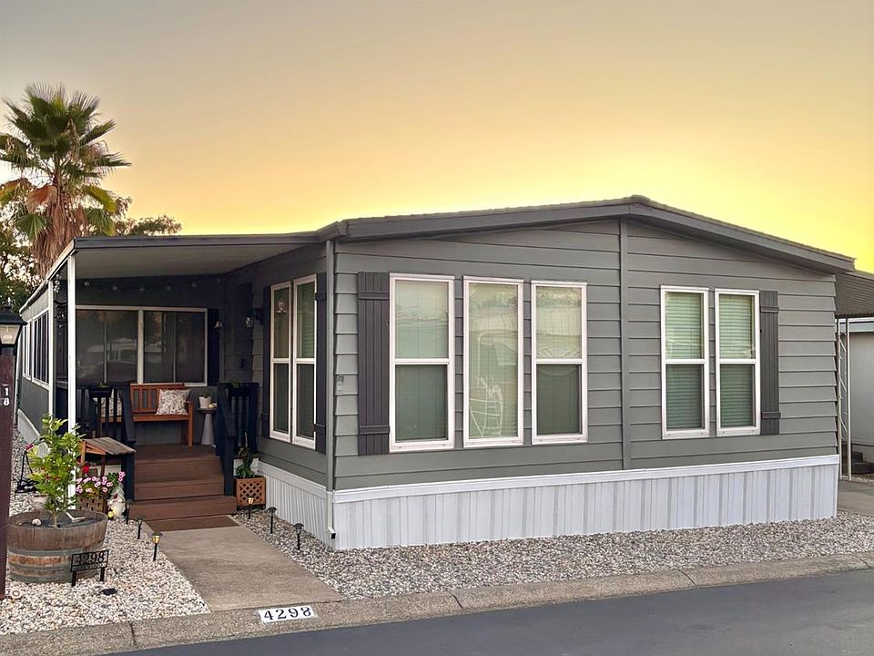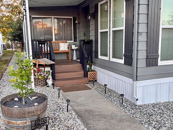 Welcome to 4298 Oakwood Street! This beautifully remodeled home offers a range of modern upgrades, including updated PEX plumbing, a tankless water heater, stylish new light fixtures, and new laminate flooring. The kitchen features stainless steel appliances and a clean, contemporary design, while the bathrooms offer unique character and charm. You'll enjoy the comfort of central heating and air, as well as the timeless appeal of solid redwood porches. The spacious living room boasts vaulted ceilings and an abundance of natural light. The home includes two generously sized bedrooms and two bathrooms. The primary bathroom features a jetted tub, separate standing shower, double-sink vanity, and ample storage with multiple cabinets. In addition to the 1,152 sq ft of living space, this home includes two sunrooms totaling an extra 234 sq ft. These versatile rooms have been used as a large walk-in closet and a home gym. The low-maintenance, landscaped backyard is a rare find for a mobile home, offering shade, raised garden beds, and a peaceful retreat. Additional features include a two-car carport, two storage sheds, and two exterior closets providing ample storage.