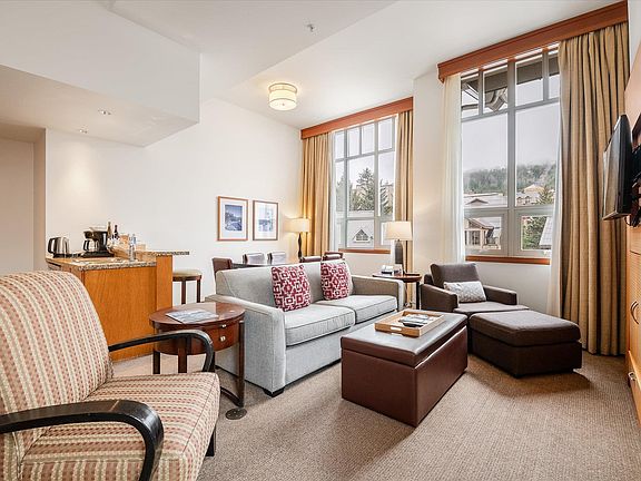 Welcome to #4407 at The Pan Pacific Whistler Village Centre! This is one of the most unique suites in the entire complex. This 2 bdrm plus den corner suite comfortably sleeps six and is located on its own private level in the annex building adjacent to the main hotel. This huge 1,202 square foot floorplan gives you 3 separate sleeping spaces along with a spacious living room, vaulted ceilings with soaring windows, a proper dining area w/ table for 6 as well as a full size kitchen. Summer or winter, you’ll enjoy the huge rooftop patio w/ incredible views of both Whistler & Blackcomb mountains & the Village Stroll. Outdoor pool, 2 hot tubs, spa, fitness center & Whistler Village right outside your door. When you’re not in town, let the award winning Pan Pacific team take care of it for you.