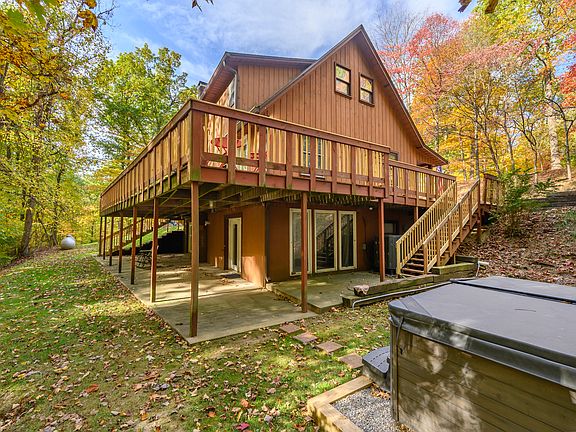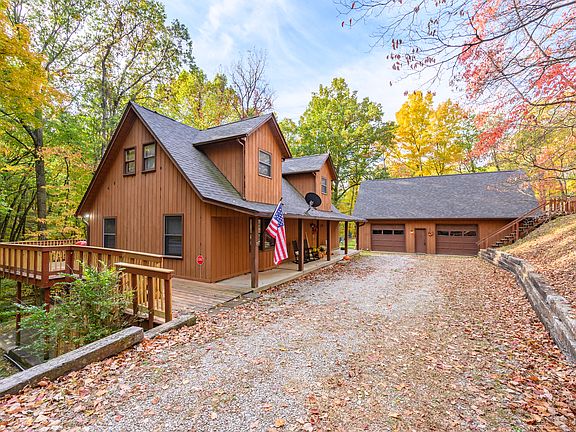 This Brown County tourist rental is a sanctuary for nature lovers, providing tranquility & comfort. Upon entry, you are embraced by the warmth of the stone fireplace that graces the living room. Upstairs are 2 bedrooms each with their own bathrooms. A balcony off the primary bedroom is the perfect place to drink your morning coffee or read a book. From the kitchen or living room, step outside onto the spacious deck, which offers a magnificent vantage point overlooking the lush woods. In the walk-out lower level is a large family room with a wood-burning fireplace and a game room that was once a bedroom. This area provides an ideal spot for socializing, playing games, or indulging in cozy evenings by the fire. Outside, relax in the hot tub under the stars or tell stories around the firepit. In addition to the main house, there is a charming one-bedroom 640 sq ft apartment located above the oversized 2-car garage. This versatile space is perfect for accommodating additional guests, offering them privacy and comfort while they enjoy their stay. For those who need to connect online, high speed fiber internet is available at the property. With its new 4 bedroom septic, this property is currently zoned as a tourist rental to sleep 8. Schedule your showing today!