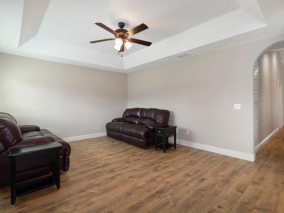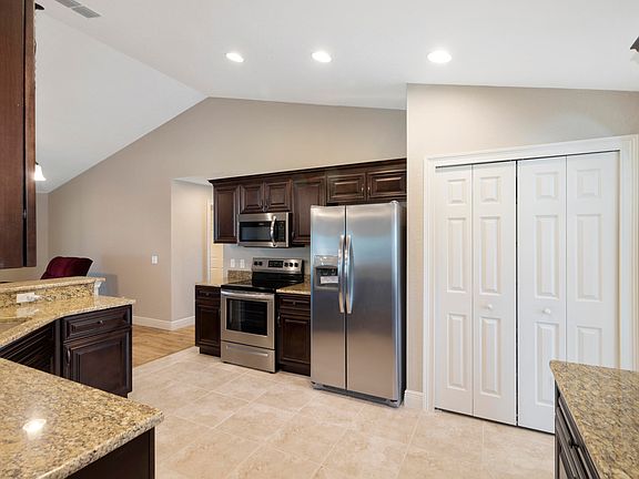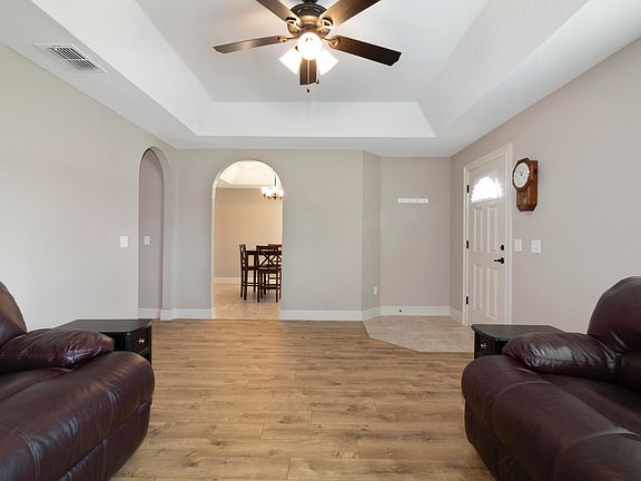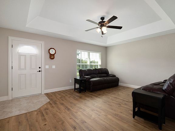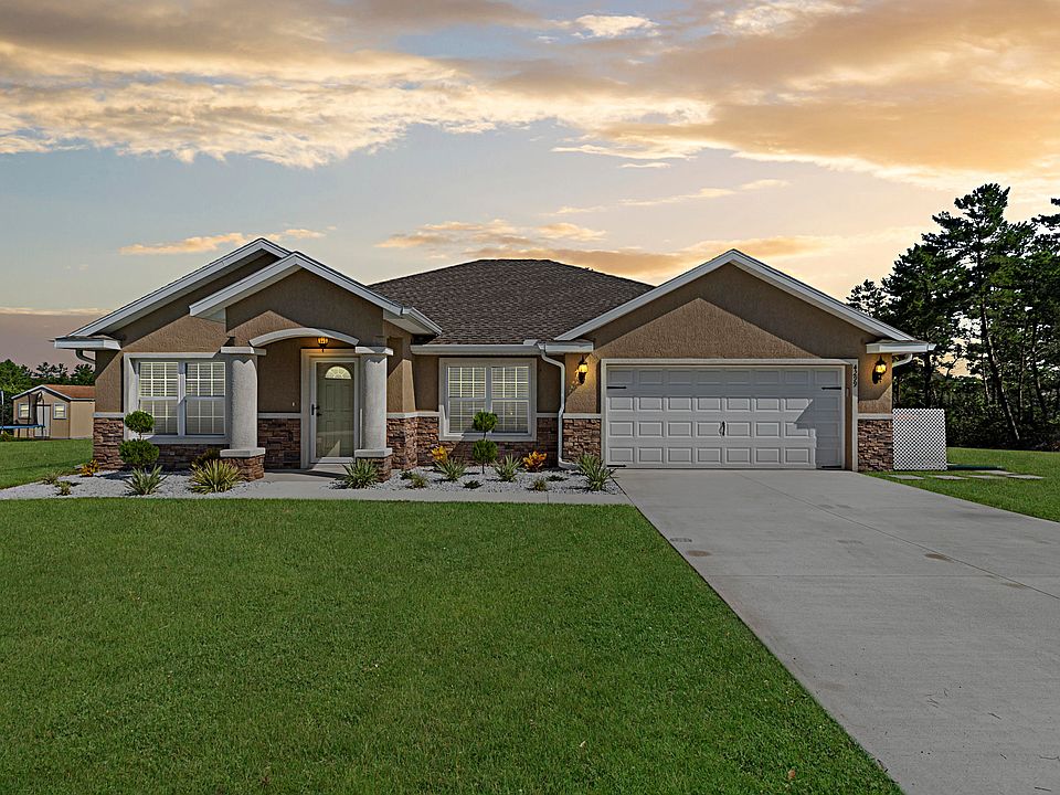 Why wait to build??? This move in ready, highly upgraded new construction home with over $30k in extras is ready for your immediate move in. From the moment you arrive, you will find lots to love in this light and bright, open floor plan home with professionally installed landscaping for extra curb appeal. Vaulted ceilings and plenty of living/flex space with 50 year laminate flooring and neutral colors throughout. Formal Living room, and a beautiful Kitchen open to the Family room with sliders to a lanai with custom installed solar shades. Kitchen features recessed lighting, upgraded cabinetry, pantry, and bar height seating for casual dining. Spacious Master suite with tray ceiling, his/her walk in closets and en suite bath with garden tub, double sink vanity, and