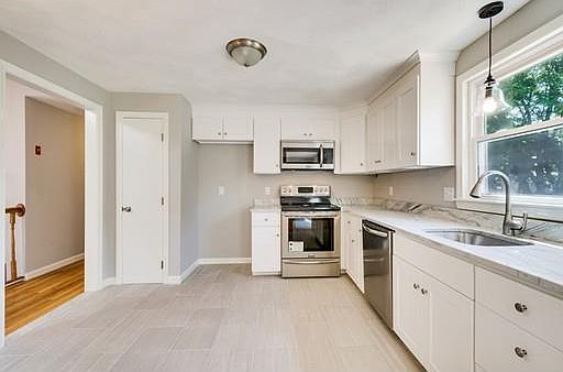 You will LOVE this newly updated West Side Split set back from the street on a large private lot! Spacious and airy living room with vaulted ceiling and skylights opens to formal dining room with French doors to deck. Eat in kitchen has been beautifully updated with modern white cabinets and crown molding to ceiling, stainless steel appliances, tiled floor, and stone counters. Updated full bath with ceramic tile floor and espresso vanity. Newly refinished hardwood floors and freshly painted throughout. New windows, roof, deck, retaining wall, front walkway, and driveway. Unfinished basement offers endless expansion possibilities. Convenient to shopping and highways. ***PLEASE DO NOT park on driveway! Just paved. Park on street and walk up***