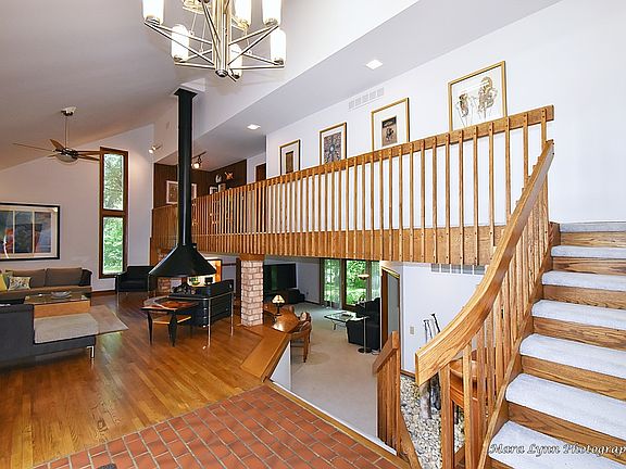 One of a kind custom home with contemporary flair...spectacular open floor plan- great for entertaining! Separate wing features a den, bedroom, and adjacent full bath-perfect for home office or in-law arrangement!! Stunning private wooded cul-de-sac lot with incredible year-round views from every window!! Enter into the foyer with soaring ceilings and skylights...living room with hardwood floors, multi-sided circular fireplace and views of the upstairs and lower-level family room. The family room has a built-in custom sunken bar and slider out to a paver patio. The large formal dining space has chevron patterned wood floors and leads into the kitchen. The fully renovated kitchen offers oak floors, cherry cabinets, granite countertops, beautiful SS appliances, island, big pantry closet and cozy eating space with fireplace!! The upstairs bedroom hall has a sitting area overlooking the living room! Primary bedroom suite with big windows overlooking the gorgeous lot and en-suite bath with dual vanities, bathtub and shower. There are 4 more bedrooms with hardwood floors and updated full hall bath. More beauty awaits you outside with a spacious paver patio that spans the width of the home offering stunning views of nature and the ever changing seasons! Three car garage too!! The convenient location is close to area schools, shopping and dining! This is truly a one of a kind home you just need to see!