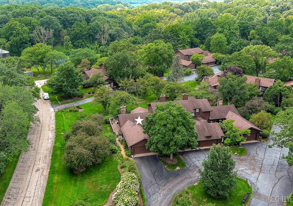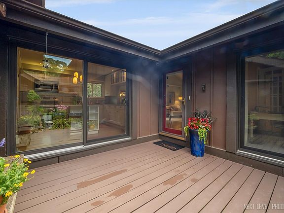 You will find no other ranch townhome to compare to this wooded retreat. The stairs have been moved, and the kitchen is now open to the vaulted, airy living space. A gas log fireplace graces the back wall. The full redesign created a sun-filled haven dominated by glass and nature views. Every room on the main level opens to the outdoors.... onto the wrap-around deck or inviting, gated, private entry courtyard. Stainless kitchen with solid surface counters, island with stools, and an eating bar area perfect for serving or breakfast coffee. MBR has a full wall of built-in closets and a private bath. The second BR is next to the full guest bath. The open staircase leads to the family room with cozy electric fireplace, and bookcases that will remain. Enjoy the extra office/craft room with an Edison fixture and barn door. The HVAC system with air-filter is new this year, still under warranty, and boasts Wireless Lennox climate control. The furnace/laundry (washer 2024) area has plenty of space and a generous storage room with sturdy shelves. Simplisafe wireless alarm system on the doors with cameras and an app. Established garden with irrigation system. Not just a townhouse, it's a lifestyle. The Windings planned community offers a St Charles address in a stunningly beautiful landscape of ravines and hills, heavily treed lots, creeks, hiking trails, and abundant wildlife. The resort-style amenities feature a newly remodeled clubhouse, pool, tennis courts (striped for pickleball), fishing pond, sledding hill, and even a skating rink in winter. It's the Americana you thought had long since disappeared. Kids still ride bikes and explore. Stars are brilliant overhead. The neighborhood hosts its own Fourth of July parade and offers a variety of planned activities for both kids and adults throughout the year. Enjoy biking, peaceful walks, or running on the Great Western Trail just steps from your door. Metra Station in Elburn brings the city closer to this fantastic neighborhood with sought-after schools, all amidst the peaceful trees!!