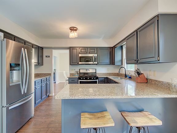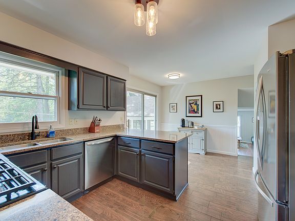 Start your next chapter in this dream home situated on a beautiful .53 acre wooded lot on a private cul de sac nestled within the community of The Windings of Ferson Creek. Upon entry you are welcomed by freshly painted walls and lots of light The spacious living room with newer flooring and recessed lighting opens into the dining room perfect for entertaining. The cozy kitchen offers the home chef stainless steel appliances, quartz countertops, and a breakfast bar perfect to sit at with stools and access your backyard through a set of sliding glass doors. The main level also hosts the 1/2 bath. The family room features a brick fireplace, wood laminate flooring, and doors to enclosed screened porch. The vaulted 3-season porch is the perfect place to enjoy the picturesque views of your large backyard and enjoy a cup of coffee or cold ice tea and enjoy the outdoors. Carpeting upstairs is new. Upstairs you can retreat to your large and spacious primary bedroom with a walk in closet and recently remodeled primary en suite full bathroom. The two other good size bedrooms share a hall bath with tub/shower. It's not over yet! The sub basement is unfinished and ready for you to transform it into your own recreational space or utilize for ample storage. The 2 car garage has an 220V sub-panel for the "mechanic" and features beautiful epoxy flooring. Relax and retreat to your private yard as well as enjoy the fantastic amenities of the Windings such as a clubhouse, pool, tennis courts, walking trails, fishing ponds, sledding hill, and access to the Great Western Trail!