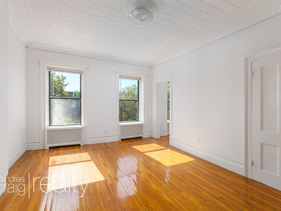 Super sunny, top-floor 1-bedroom plus den floor-through apartment. Hardwood floors and windows throughout provide a warm, comfortable feel to your very own brownstone apartment. Enter into a spacious dining area with plenty of room for a formal setup and two windows overlooking the back gardens. Off the dining area is an alcove kitchen with ample cabinet space. Adjacent to the first two rooms is a well-kept bathroom featuring a step-in shower and skylight.