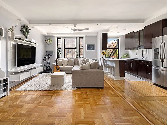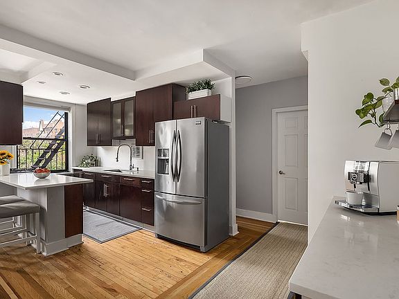 Welcome to this recently renovated home that is a sunny, spacious sanctuary of peace and tranquility. The apartment boasts ample closet and storage space, perfect for keeping your belongings organized. Featuring beautiful hardwood floors that add warmth and charm, along with expansive windows that offer charming views of the neighborhood, this apartment exudes a bright and cheerful atmosphere that will uplift your spirits every day. As you step into the proper foyer, a feeling of home envelops you, gracefully dividing the living space from the office/flex room for privacy and comfort. The living area beckons with natural light streaming in from a wall of west-facing windows, creating a cozy and inviting ambiance. The spacious living room offers flexibility for a dining area, perfect for entertaining guests or enjoying a meal with loved ones. Off the living room, the windowed kitchen is a chef's dream, featuring updated tile floors, sleek quartz countertops and backsplash, generous cabinetry and counter space, and new appliances including a dishwasher, oven, microwave, and refrigerator. The flexible layout of the kitchen opens seamlessly to the living room, allowing for easy flow and convenience, with a breakfast bar adding a touch of modern style to the space.
