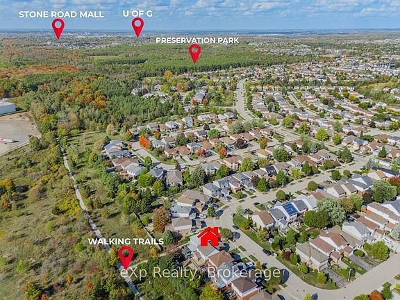 Located on a quiet crescent with a walkout basement overlooking greenspace! This home will suit many buyers' needs - stamped concrete entranceway leading inside to the main level with living room/dining room featuring hardwood flooring, kitchen was updated with new cabinet doors and countertops in 2019, and has a dinette with vaulted ceiling that leads to the large deck overlooking the walking trails and beautiful tree line. There is also a 2-piece on this level and direct access to the garage. Upstairs has three bedrooms and a 4-piece bath. The basement is finished with a large family room and a perfect area for a fourth bedroom should you desire. This level walks out to the private backyard, and could easily be used as a separate entrance. The location is perfect for growing families, commuters, or parents of UofG students, as it's completely surrounded by great amenities and has easy access to Highway 6. Roof 2015, water heater 2022, water softener 2022, basement 2022, deck 2020. Flexible closing available.