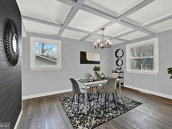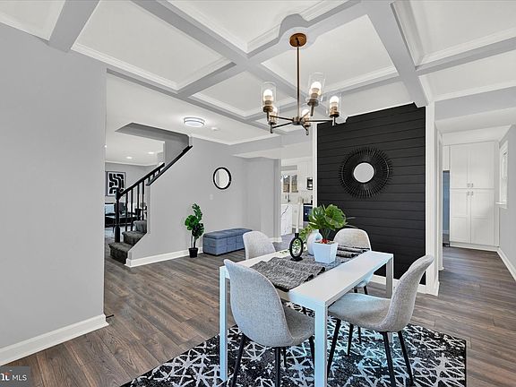 Welcome to 43 Caraway Rd! This fully renovated gem offers contemporary elegance and comfortable living in every corner. Boasting 4 bedrooms, 2.5 bathrooms, and approximately 2,432 square feet of thoughtfully designed living space, this home is a testament to modern luxury. Upon entering the main living level, you'll be greeted by a spacious living room, perfect for relaxation and entertaining alike. The adjacent dining room is enhanced by a stylish accent wall and coffered ceiling, adding a touch of sophistication. The eat-in kitchen is a chef's dream, featuring stunning Calcutta quartz countertops with waterfall island, stainless steel appliances, and sleek white shaker cabinets. A half bath on this level adds convenience for guests and residents alike. Ascend upstairs to discover four generously sized bedrooms, including the impressive primary suite. Retreat to your private oasis complete with a spa-like bathroom featuring luxurious marble tile flooring. An additional full bathroom is conveniently located in the hallway, ensuring comfort for all. The finished lower level offers even more space for recreation and storage, with a large rec room area and a dedicated storage room. Throughout the home, you'll appreciate the many upgrades, including new laminate plank flooring, modern fixtures, and attention to detail at every turn. Outside, the large rear yard with a patio provides the perfect backdrop for outdoor gatherings and relaxation. A private driveway adds to the convenience of this property, while its convenient location in Pikesville puts you within reach of everything you need. Don't miss your chance to experience the epitome of modern living at 43 Caraway Rd. Schedule your showing today and make this stunning home your own.