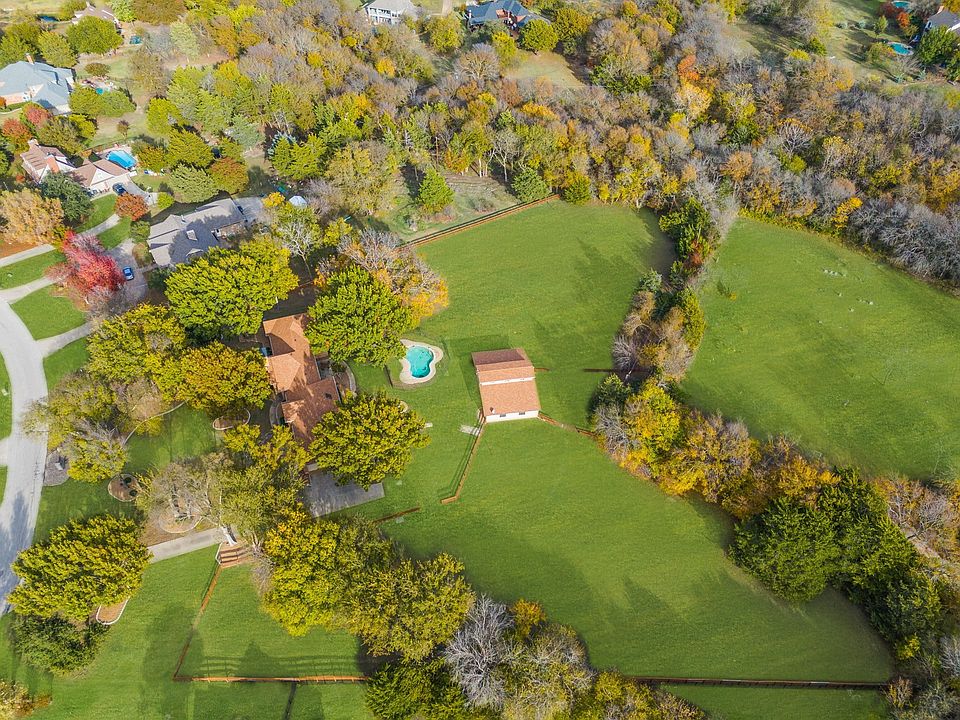 Peaceful Living on 3.75 Acres in Gated Country Ridge in Melissa * Panoramic Treeline Views, backing to Creek * 2-Stall Barn with Barnyard for Future Horses if desired * Swimming Pool ... A Rare Find so Close to the City!! Nestled among majestic trees is a nearly 3100 sqft 1-story 4-bedroom home with a 3-car garage. You'll be impressed with the distinctive great room for its vaulted ceiling, beautiful wood-paneled walls, classic built-ins with a hidden wet bar + a woodburning fireplace. Cheerful, sizeable formals are ideal for hosting family & friends. This tranquil residence is a renovator's dream! Kitchen boasts a breakfast nook bay window & coved ceiling. Primary bedroom also has a woodburning fireplace + 2 walk-in closets & a skylight in the spacious bathroom. Big utility room too with a handy 2nd powder bath. Unlimited possibilities for the barn: for your beloved horses, a workshop, collectible storage or entertainment space. Includes a tack room & rafter storage too. Amazing views with no neighbors behind! Inspired country living, exceptionally private, endless potential in a great location ~ create your own sanctuary here!