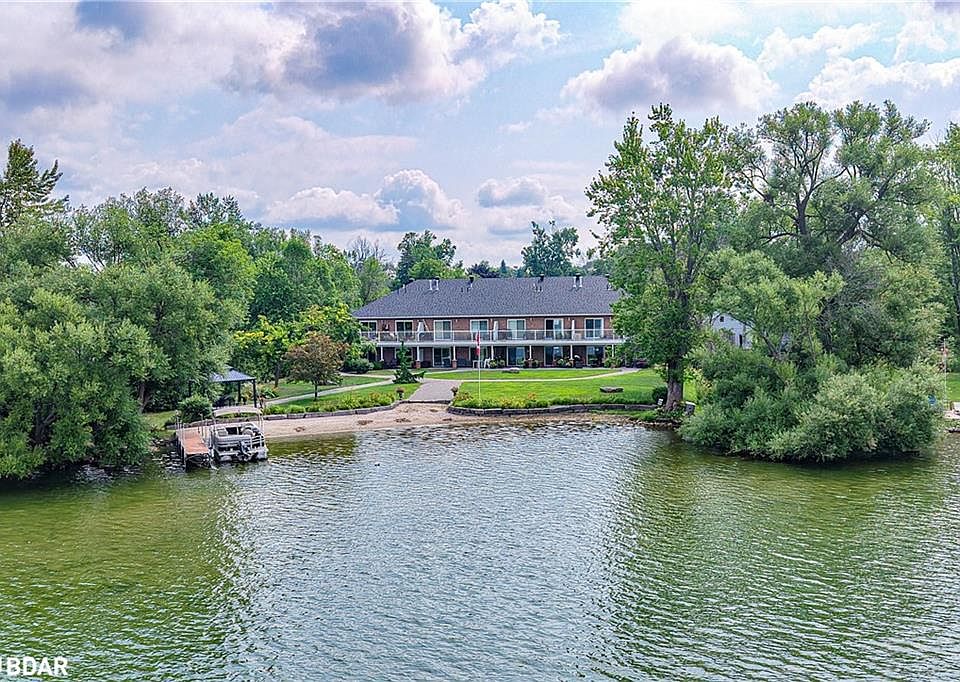 Welcome to Atherley Gardens and waterfront living on Lake Simcoe! This boutique complex is comprised of only 8 units, each with its own double car garage plus 2 exterior parking spots. Featuring direct beach access and spectacular unobstructed water views from this second floor end unit. With no lobby and no elevator, Atherley Gardens is unique with direct access to the unit from the covered front deck. The end unit offers a cozy corner to sit and relax on the front deck, as well as a private lakeside balcony with room for your bbq, outdoor dining, and picturesque sunsets. The moment you step inside this carpet free home, the open concept kitchen dining living area showcases the waterfront view. The classic white kitchen offers plenty of cabinetry, centre island with additional storage and plenty of gorgeous granite counter space which flows seamlessly to the spacious dining and living area perfect for entertaining. The king size primary bedroom also has access to the lakeside deck plus an ensuite with a large jetted tub and new walk in shower(2025). Another full bathroom, in-suite laundry with new washer (2022), new owned hot water tank (2022) and new shingles (2025). Swim, kayak, boat, walk & bike the trails, minutes to marinas, Orillia and Casino Rama, this central location offers convenient year round living or a care-free cottage getaway!