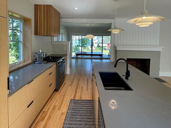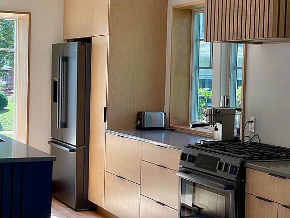 The new (Brand New As of 2024) Scandinavian style kitchen features modern white oak cabinets, quartz countertops, custom designed island and range hood, Bosch appliances and designer lighting fixtures.