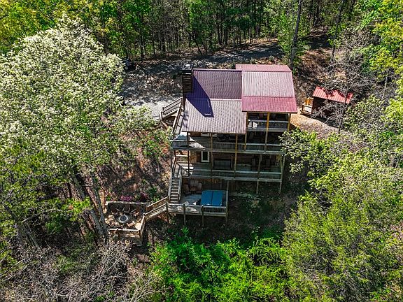 This stunning, like-new 3 Bed/3 Bath mountain retreat offers jaw-dropping, long range, layered mountain views from nearly every space & an ideal layout for entertaining, relaxing, or hosting guests. Step inside this true log cabin to discover a bright, open-concept living space with soaring ceilings, cozy stone fireplace & French doors that lead to an expansive covered porch—perfect for soaking in those sweeping mountain vistas. The beautifully designed kitchen is a chef's dream, featuring a quartz waterfall countertop island, stainless steel appliances, commercial gas range with custom hood & ample space to create and gather. The spacious main-level primary suite offers a serene retreat, complete with large windows framing the view and a porcelain-tiled shower & separate vanity area. Upstairs, a generous loft bedroom opens to a private balcony with dramatic views. The upper suite is complemented by a luxurious tiled shower, spacious vanity, and a separate vanity and water closet for enhanced privacy & comfort. The fully finished terrace level is a private escape of its own, offering a secondary living area, arcade game, sleek wet bar with wine fridge, full bath with tiled tub/shower combo & an oversized guest suite featuring 2 queen beds, a walk-in closet & stunning views. Step outside to the large, lower-level covered patio, then wander down to your secluded hot tub deck nestled among the trees—an idyllic space for soaking in the mountain air. Just beyond, a custom-built firepit area invites unforgettable evenings under the stars. Additional features include a level driveway, log-sided storage shed & community features like access to the serene Lake Buckhorn. Ideally situated just 10 mins from Downtown Ellijay & 15 mins from Blue Ridge on all paved roads, this property offers both privacy & convenience. Sold fully furnished & turn-key—perfect as a full-time residence, refined mountain getaway, or premium STR investment.