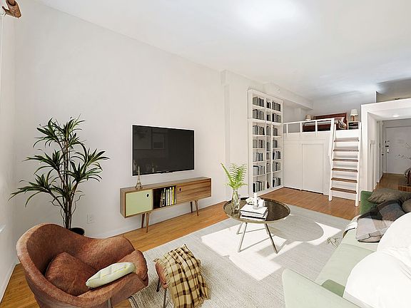 Located in the heart of Greenwich Village. This loft apartment has 10’2” ceilings. South facing with lots of sun and sky all day. The lofted bedroom can fit a queen-sized bed, nightstands and platform storage. Underneath the loft also has storage and closets. 43 East 10th Street is a boutique elevator pre-war co-op with 51 units. The building features intercom security, a live-in Super, central laundry room, a beautifully landscaped roof-deck, bike room and a common storage room.