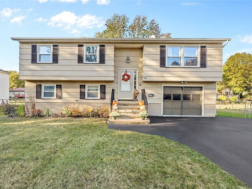 Welcome home to 43 Gemini Circle, a move-in-ready 3-bedroom, 2 full baths raised ranch with exceptional flexibility for today’s lifestyle. The upper level features a bright, open layout with an updated kitchen, formal dining and a large, bright living room. The lower level includes a full second kitchen, spacious family room or potential fourth bedroom, full bath, and laundry. Perfect for an in-law or teen suite, extended family, or those who love to entertain and cook with extra space for meal prep and gatherings. Enjoy the partially fenced yard with a patio ideal for relaxing or hosting guests. All appliances included! Freshly painted, new luxury vinyl flooring, 2021 furnace and central air, vinyl windows, and solid mechanics. All appliances included! On a quiet street that is conveniently located minutes from every amenity: shopping, Wegmans, restaurants, school, the expressway and more. Delayed showing until Thursday, October 9, at 10 am and delayed negotiations on Tuesday, October 14, at 3:00 PM. Open houses: Thursday, October 9, from 5-7pm, and on Sunday, October 12, from 2-4pm.