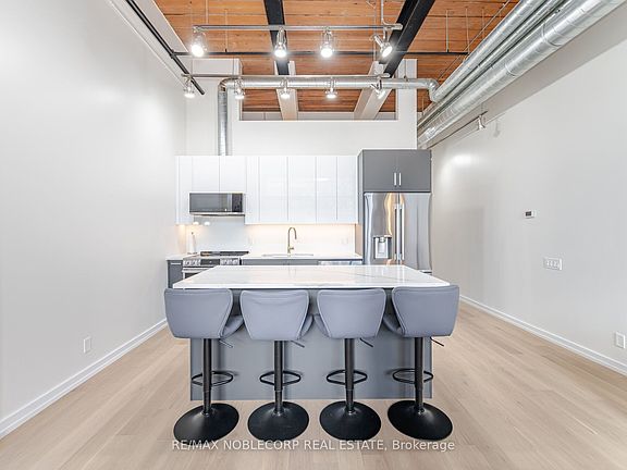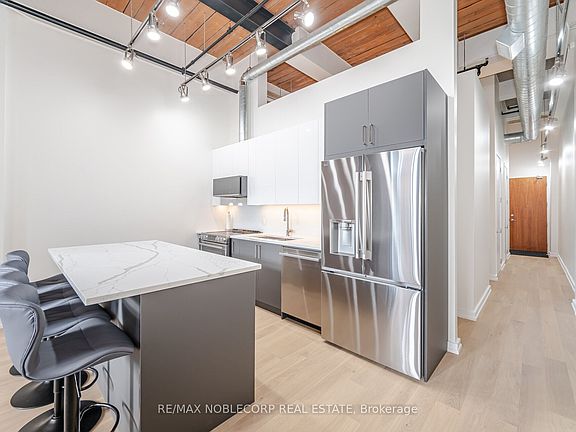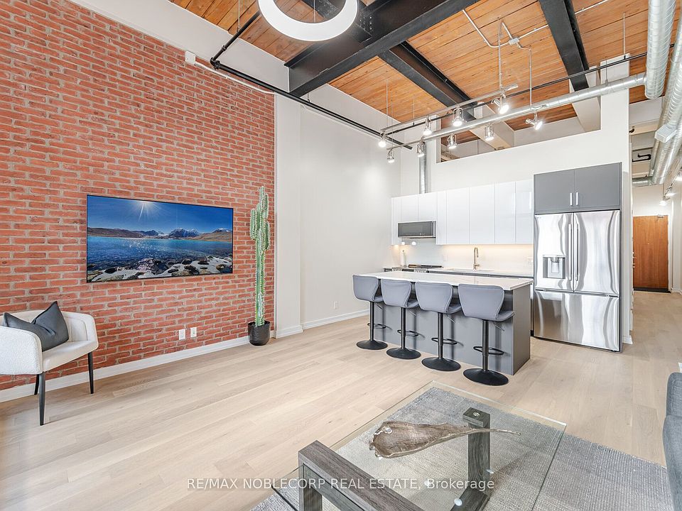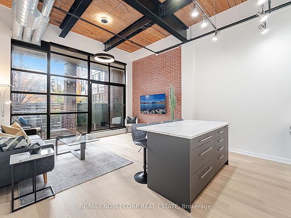 Welcome to one of the most impressive lofts in the city, located in one of its most sought-after buildings! Be the first to enjoy this brand new unit - extensively renovated to the nines and never lived in! This rare, sunny, south-facing hard loft features a large original brick private terrace. The ground floor location offers a beautiful view backing onto the quiet, gated private courtyard. Soaring 13 ft. wood beam ceilings and exposed red brick create the perfect blend of old industrial charm and modern, sleek, high-end finishes. Enjoy easy, elevator-free access with prime ground floor parking and a locker literally just steps from the unit - living here truly feels more like a house. This loft has undergone a complete high- end renovation with the highest quality materials: brand new hardwood flooring, a stunning new bathroom with large porcelain tiles, heated floors, an oversized soaker tub, and premium vanities. The brand new two-tone kitchen features a custom glass backsplash and over $10K spent on top-of-the-line appliances. The exposed brick wall in the living area gives this unit a true "wow" factor - a special, unique space that shows 10/10! This unit is ideally situated on the south side of the building and is one of the few with outdoor space offering this desirable exposure. No need to worry about future condos being built in front of you! The building is exceptionally well-managed with low maintenance fees. Enjoy a convenient 5-minute walk to Exhibition GO Station with easy access to Union Station in just 8 minutes. A future subway station and a large park are also being developed right across the street.
