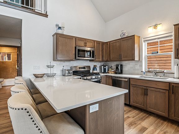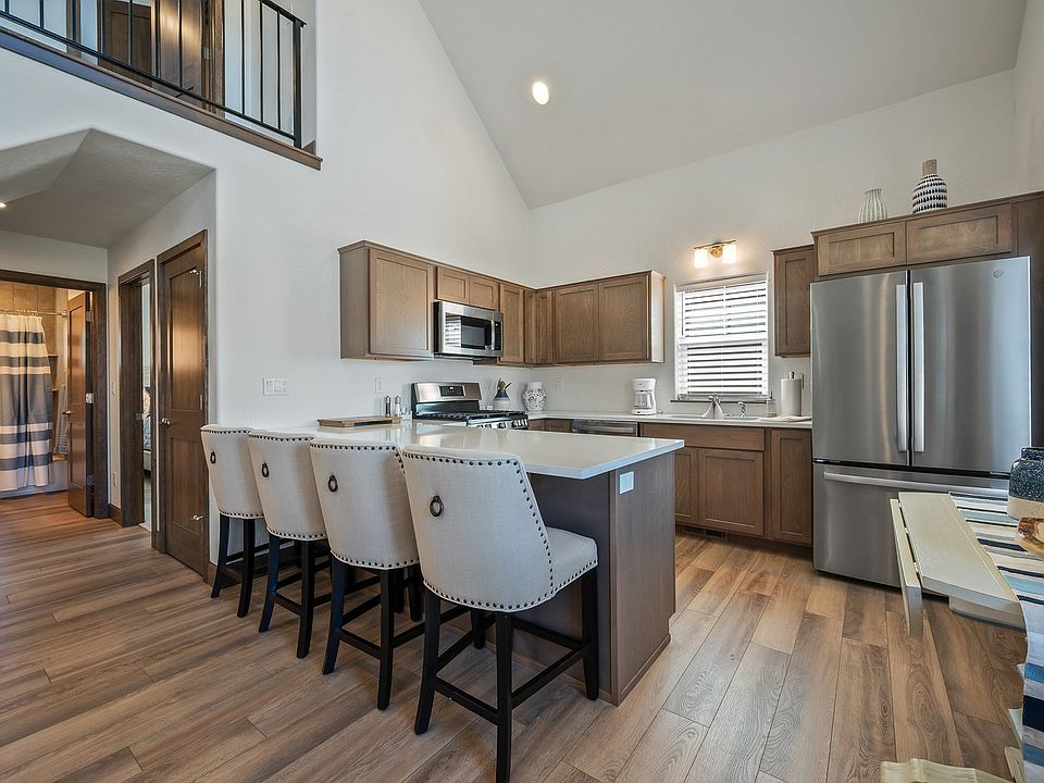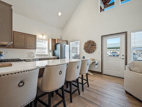 The home features three sleeping areas and two full bathrooms across a spacious and functional layout. On the main floor, you'll find two bedrooms. Bedroom one is furnished with a king bed, and bedroom two has a queen bed. Both are conveniently located on the main level and share access to a full bathroom. Upstairs, there is a large bonus room that serves as bedroom three. This flexible space includes both a twin bed and a full bed, along with the home's second full bathroom, offering a great setup for guests, kids, or a quiet office retreat.