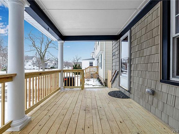 Charming 4 bedroom colonial. Wonderful covered newly built front porch in 2022 welcomes you to 43 Kenton Road in Kenmore. Hardwood floors in LR, DR, and 2nd floor hallway and bedrooms. Home features spacious living room with built ins. Formal dining room opens to kitchen and living space. Bright and efficient kitchen with new appliances 2021-2022. Home also features primary bedroom with fully remodeled bath in 2019. Second updated full bath remodeled 2022 with soaking tub. One bedroom currently being used as walk-in closet. Possible 4th bedroom on 3rd floor currently used as a home office/den. Partially finished basement for extra bonus space with new vinyl flooring added in 2022. Two car detached garage with covered patio and new garage doors in 2022. Open House 1-3pm on 2/4 & 2/5. Showings begin on 2/2. Offers if any, are due by 3pm on 2/8. Don't miss out on this beautiful village home close to all conveniences!