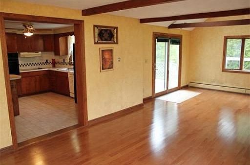 Not your typical ranch. This home offers a very large 33 x 15 cathedral ceiling family room with gleaming hardwood flooring and french doors to private deck and yard. Set on a corner lot this home offers private back yard yet close to town park...ball fields...shopping and the McGovern school .Large partially finished basement with 2 rooms. Town water and sewer. Nice home.
