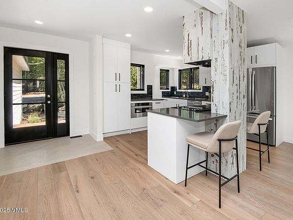 Completely renovated in 2025, this south-facing home backs to Homestead Open Space and Lake Creek with sweeping New York Mountain views. Updates include quartz countertops, wood flooring, refreshed baths, new carpet, exterior paint, gutters, doors, sliders, and composite decking on two of three outdoor spaces. Mature landscaping provides privacy and enhances the mountain setting.