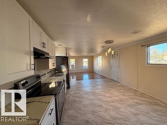 This open plan mobile home is bright and has had some upgrades started for you! There are newer white cabinets in the kitchen, tile backsplash and the appliances are only 5 yrs old approx. There is laminate and vinyl tile flooring and there is newer led lighting. The bathroom has been updated with a new toilet and newer tub with tile surround. The furnace is newer, the HWT was replaced in 2024, new heat tape was installed just this year and the main water line under the home and the plumbing under the kitchen sink was replaced with pex. The front of the home has been vinyl sided and there are newer front windows. Washer and Dryer included. Good sized partially fenced yard. There is some work required. Immediate possession available! Don’t wait to view!