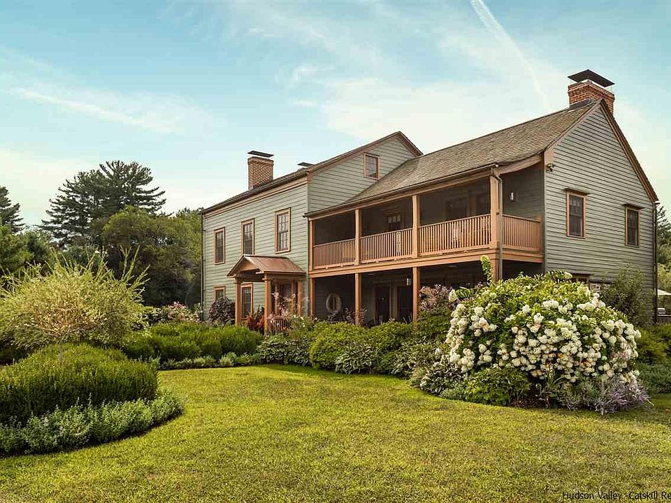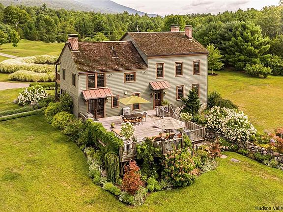 A long, tree-lined drive leads to this meticulously crafted 1790 Federal style home, which was disassembled, relocated from its original site in Dutchess County, and exactingly reassembled on its current site by a noted master craftsman in 2006. The soul and detail of an elegant older home coexist with the conveniences of new construction as a result of the modern infrastructure and building techniques that were employed in the transition. Exposed original beams, wide-plank flooring, four wood-burning fireplaces, exposed stonework and multi-paned windows dovetail seamlessly with luxe bathrooms, a cook's dream of a kitchen, central air, and all the space and amenities one would need to entertain in style. Bedrooms are inviting, living and dining rooms are graceful, and the family room, with heated brick floors, is an ideal spot for a home-office. Spectacular mountain views, lush landscaping, a spring-fed pond, lovely meadows and historic barns are a sure reminder that the city is far, far away.