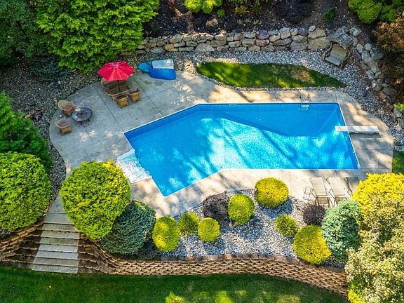Welcome to 43 Round Hill Rd, a beautifully maintained 4-bedroom, 2.1-bath Center Hall Colonial set back off the street in one of Kinnelon's most desirable neighborhoods. The formal living and dining rooms create an elegant backdrop for gatherings, while the spacious great room dazzles with soaring ceilings, a dramatic fireplace, and abundant natural light. The designer eat-in kitchen showcases high-end appliances, custom cabinetry, and travertine tile, flowing easily into casual dining and entertaining spaces. A flexible office/guest room, main floor laundry/mudroom with deck access, and a convenient half bath for poolside guests enhance everyday comfort. Upstairs, the primary suite boasts generous space, his-and-hers walk-in closets, and a well-appointed bath, joined by three additional bedrooms and full bath. The finished lower level offers room for recreation, office, or gym. Outdoors, enjoy a private wooded retreat with heated in-ground pool, newer liner, expansive patio, deck, and professionally landscaped grounds. Highlights include hardwood floors, newer roof, multi-zone central air, 4-zone hot water baseboard heat, a two-and-a-half-car garage, sprinkler system, ample driveway parking, public water, and natural gas perfect for living and entertaining inside and out.