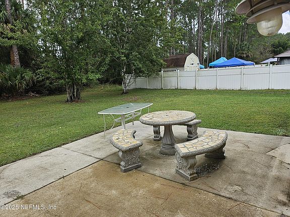 Enjoy the benefits of living in Palm Coast on a spacious lot in a welcoming concrete block home; inside and outside are newly painted with brand new laminate flooring. The central kitchen has convenient access to the desirable separate dining room. Across from the dining room is front flex-space for office/study, playroom, etc. Private primary bedroom has a nice walk-in closet and en-suite bath. The additional two bedrooms are split across the living room with middle second bathroom. Sliding doors open to the patio and over-sized lot. Stainless steel appliances remain, including washer and dryer (as-is) for move-in convenience. Storage shed remains