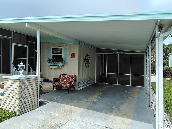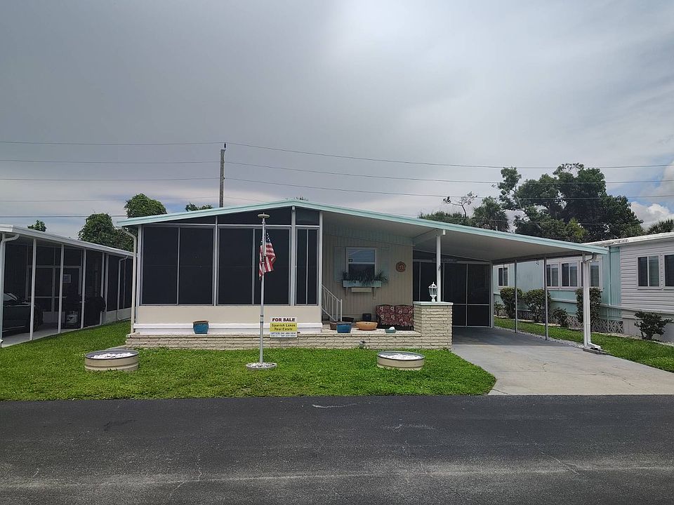 Welcome to 43 Sierra Vista - your slice of Margaritaville in Spanish Lakes! Step into paradise the moment you enter the lanai of this beautifully updated 2-bedroom, 2-bathroom home in the desirable dog section of Spanish Lakes, a vibrant 55+ community. This home is fully remodeled, the oversized upgraded kitchen has tons of cabinet and storage space, and the countertops, sink and garbage disposal have just been replaced in June of 2025. New sub-floors and flooring throughout, newly updated bathrooms, new windows throughout the home and the vapor barrier and tie downs have been replaced for your piece of mind. This home has updated appliances, and they all stay with the home. There are two lanais, the upper lanai has a working ac unit, and the lower lanai is enclosed where the sliders open large enough to park your golf cart inside and out of the sun. This home is not just a place to live, it's a lifestyle. Whether you are relaxing on the lanai, entertaining friends, or cruising the community in your golf cart, 43 Sierra Vista offers the perfect blend of comfort and coastal charm. Spanish Lakes is an active 55+, land lease, background/credit check, community. Monthly lot rent includes land tax, water, sewer, lawn mowing, basic cable television, weekly garbage/recycling & yard waste pick-up, and use of all amenities. Spanish Lakes offers a heated pool, saunas, clubhouse, library, craft and meeting rooms, shuffleboard, bocce ball, horseshoes and more! The listing information provided by the seller is deemed reliable but not guaranteed and should be independently verified through personal inspection by appropriate professionals. Spanish Lakes Mobile Home Park cannot guarantee or warrant the accuracy of this information or condition of this property.