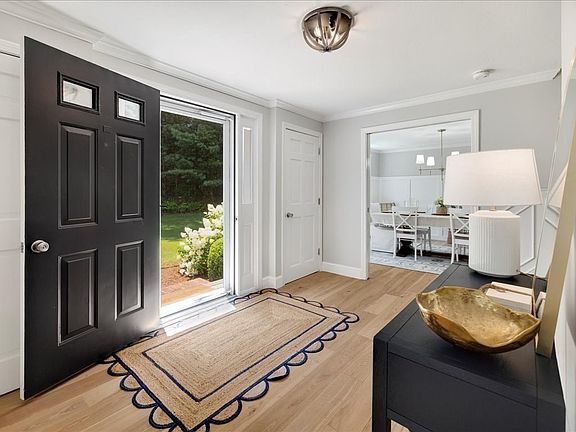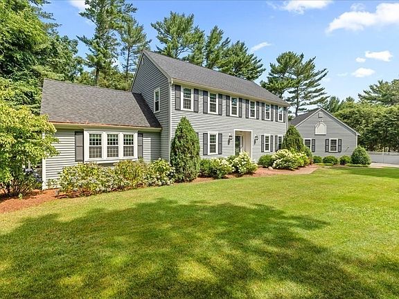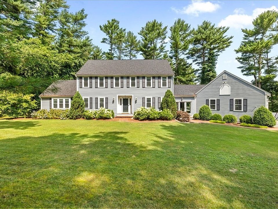 This charming colonial is located in the highly sought-after Weston Farm neighborhood. Nestled on a tranquil wooded lot, this spacious residence features an expansive family room with a large fireplace and cathedral ceilings. The updated entertainment-sized kitchen boasts a center island and eating area adjacent. The formal living spaces include a dining room and a living room, both with pocket doors. Enjoy the 3-season breezeway with access to an oversized deck complete with an outdoor shower overlooking the private backyard. Upstairs, the primary suite features 9-foot ceilings, a walk-in closet, and a newly renovated private bath. Three additional bedrooms and a newer tiled bath complete the 2nd floor. Additional features: finished walk-out lower level, unfinished walk-up attic, attached 2-car garage with attic space above, irrigation system and numerous recent upgrades.