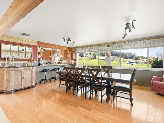 Classic farmhouse on 6.44 acres with stunning mountain views! Peek-a-boo ocean views from north side of home. Main home boasts 4 bedrooms, 2.5 bathrooms plus office space. Fireplace in living room, large formal dining area. Kitchen has stainless steel appliances. Bathroom off Primary bedroom has programable bubble jetted tub and heated floor. Heat pump. Guest house has 2 bedrooms, 1 bath with living room with ductless heat pump and kitchen. Beautiful garden and greenhouse, brand new roof on barn with coral and stalls. Large 1728 sf garage has 4 tall spaces with workshop area, wood stove and storage. RV Parking as well. Pond is fed by a natural spring and is seasonal. There are multiple fruit trees and berry bushes. 10 minutes to town.