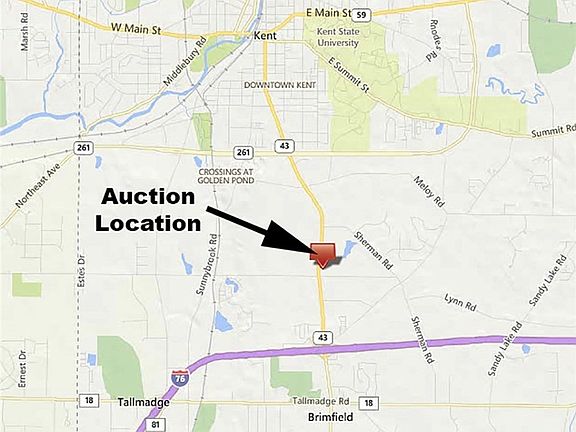 Griggy Trust Auction - 14.5 Acres Vacant Land – Sold In Two Parcels - Zoned G-C General Commercial – Public Sewer Available - Portage Co. – Brimfield Twp. – Corner Tract - ABSOLUTE AUCTION, all sells to the highest bidder on location: WEDNESDAY - JULY 12, 2017 – 6:00 PM - Parcel #1 – 4.331 acres – parcel #04-014-00-00-035-000. Corner tract of vacant land, all open with frontage on Howe Rd. & St. Rt. 43. Parcel #2 – 10.232 acres – parcel #04-014-00-00-035-003. Frontage on St. Rt. 43 and Howe Rd. Approx. 1/3 open, 2/3 wooded. TERMS ON REAL ESTATE: 10% down auction day, balance due at closing. A 10% buyer’s premium will be added to the highest bid to establish the purchase price, which goes to the seller. Any desired inspections must be made prior to bidding. All information contained herein was derived from sources believed to be correct. Information is believed to be accurate but not guaranteed.