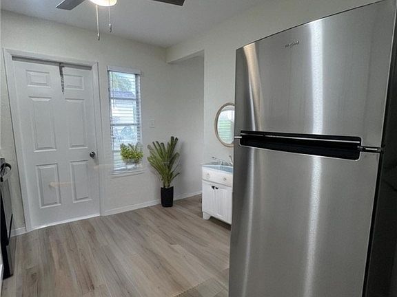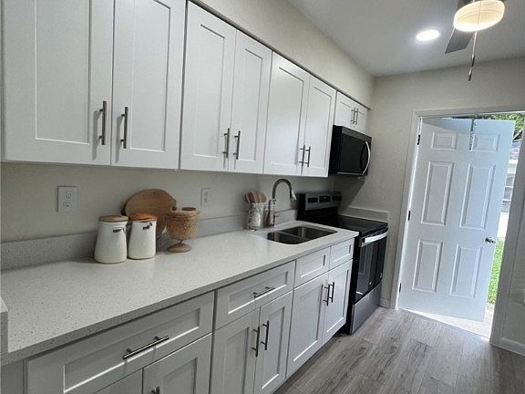 Just Listed. Stunning all brand newly updated, and ready to become your new home. 2BD/2BA. New wood plank flooring throughout, brand new updated kitchen with stainless appliances, smooth top stove, Quartz countertop. All newly painted, updated two full baths, nice brand-new stackable washer/dryer included, new ceiling fans in all rooms, walk-in closet and lots of windows with new treatments to let that Florida sunshine in. Second door access from the kitchen. Lovely quiet 55+ community featuring private parks with shuffleboard and seating areas right across the street. Beautiful flowering shrubs, and freshly updated beds. **Lawn Care and Trash Included. Service Animals allowed. Call for your personal showing appt.