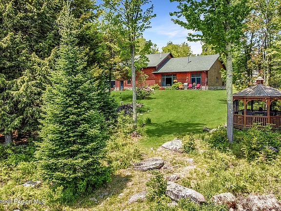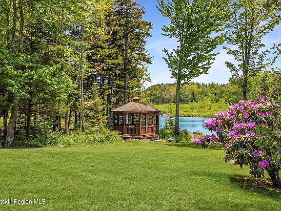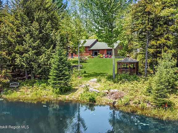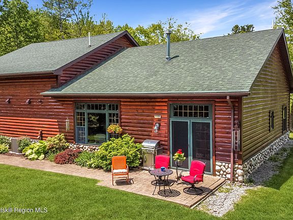 Welcome to an extraordinary retreat in the heart of the Catskills, a sophisticated log cabin that artfully balances rustic charm with modern elegance. Set against the backdrop of a tranquil pond and mountain vistas, this property is a sanctuary of comfort and style, ideal for relaxation or adventure. Just minutes from Hunter Mountain, North-South Lake, and Kaaterskill Falls, this location offers unparalleled access to hiking, skiing, and year-round outdoor activities. Step into an inviting open-concept living space, where a dramatic floor-to-ceiling, double-sided fireplace takes center stage.
