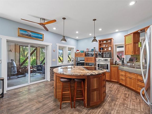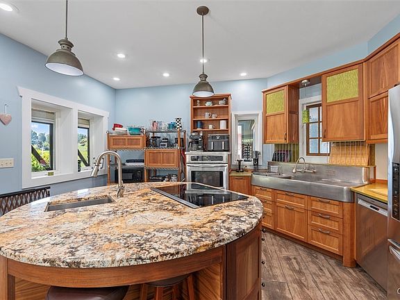 Contemporary wood stoveCircular black walnut islandStone patioSoaring ceilingsCustom cherry doorsDesigner kitchenPizza oven
