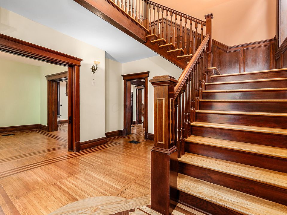 Privately nestled behind mature landscaping, this fully restored home showcases historic charm at every turn: original double oak entry doors, three sets of pocket doors, ornate fireplace mantels, a grand staircase, and beautifully inlaid hardwood floors.