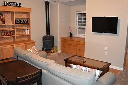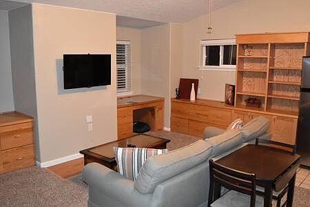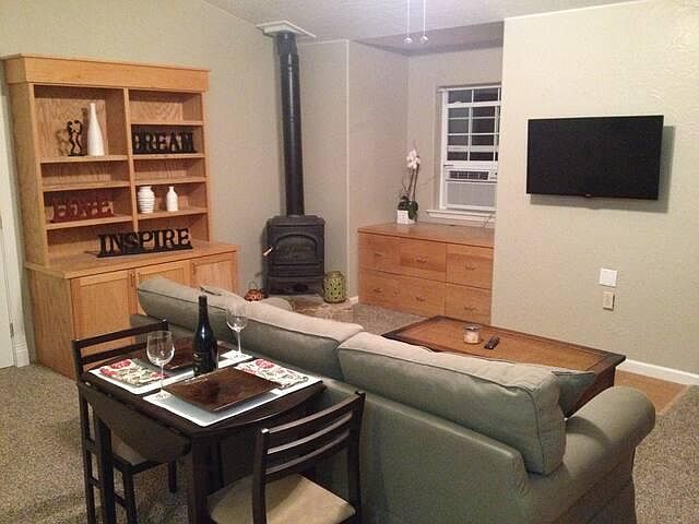 Fully Furnished 1 Bedroom Apartment with private entrance located above owner's attached garage. The home and apartment is located on 5 acres in a quiet neighborhood in south Reno (3.5 miles south of the Summit Mall). - No smoking. - No Pets. - No inside or outside storage area (other than insides the apartment). - 1 Bedroom Apartment located above the owner's attached garage. - Private entry and 2 uncovered gravel parking spaces. - Total living space is 625 sq. ft. - Completely remodeled in July 2014. - New appliances in 2014 include: full size fridge, electric range and microwave. - Small private porch. - Heat provided by propane cast iron stove. - Window A/C unit (new in 2014). - Ceiling fans in the bedroom and living areas. - All utilities included (electric, wireless internet, water, propane, sewer) - No washer and dryer will be provided - Furnishings included: o 39" wall mounted SMART TV. o Bedroom: Queen size bed and 2 night stands. o Kitchen: Dining table with 2 chairs. o Living Room: Large couch (without a pullout bed) and coffee table. o Porch has two chairs and small table. o Kitchen is stocked (Essential cookware, dishes etc.) - Option for housekeeping services (at an additional charge)
