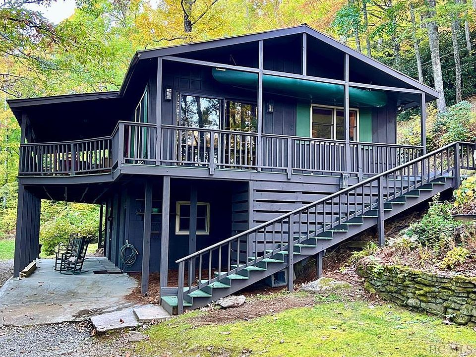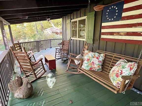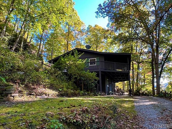 Hillside Hollow is a quintessential mountain cottage, nestled on a wooded hillside in the beautiful neighborhood of Bright Mountain. It is less than 15 minutes from the Cashiers Cross Roads. This Lake Glenville community is convenient to so many hiking trails, waterfalls and lake access points. The cabin was built in 1964 and was remodeled in 1992 and 2022 but still retains its fabulous special vintage cozy mountain charm! As there is no official HOA, the opportunity to rent short term will allow this property to possibly be income producing if so desired. The main level features a spacious foyer for all your hiking gear, a well aged wood sided powder room and the cozy living area with natural light and easy access to the covered outdoor porch. The kitchen is open, with lots of storage and cabinet space. On one end of the vaulted-ceiling kitchen space is a large dining area.The primary bedrm and bath are also located on the main level. The primary bedrm features a dressing room with built in clothing and linen storage. Rounding out the main level is the covered front porch with dining table, rockers and a swing. It is by far the greatest room in the house during the cool mountain Summers. An open side deck provides a place for many days relaxing in the sunshine. On the lower level, there is a bonus room with bunk beds. This room is perfect to be a game room or for overflow sleeping space. This lower room also has access to a lower level slab-patio. The second bedrm and full bath is located off the bonus room. The property has a cool old fire pit with stone benches and a good size shed that can be used for storage or a potting shed.This .80 acre lot also has plenty of space for a dog yard or playground The yard is mainly flat and terraced, giving you several great areas to entertain outside. This property offers ample parking and a U shaped drive for easy ingress/egress. Bright Mountain is a charming neighborhood and very walkable. The seller is a NC Licensed agent.