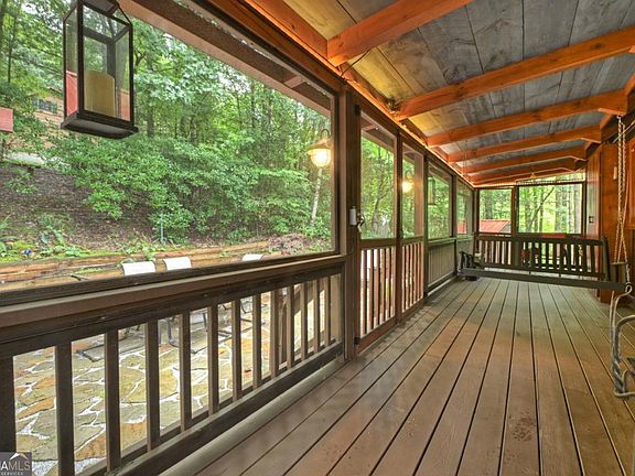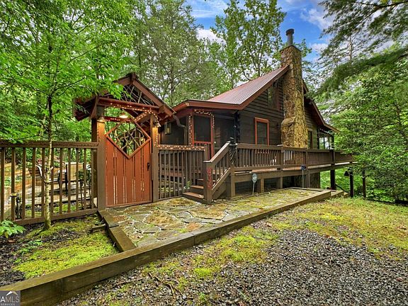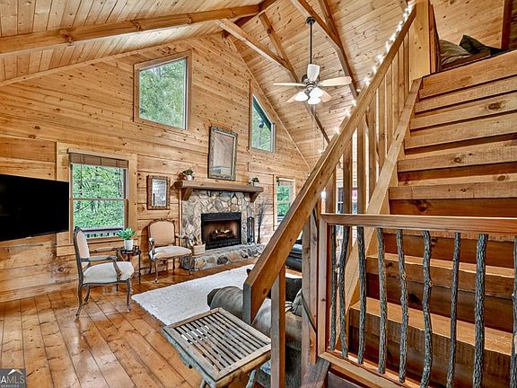 Nestled deep within the scenic charm of the Blue Ridge Mountains, this whimsical, cottage-style log cabin offers a serene escape in a private, gated community. Surrounded by rustic homes, majestic mountain views, and a community pond and garden, this cozy retreat blends timeless charm with modern comfort. The two-bedroom, two-and-a-half-bathroom home also features a generous loft space, ideal for office, additional sleeping quarters, & more. Rich wood floors flow throughout, complemented by soaring ceilings and expansive windows that invite natural light and unforgettable views. A striking stone fireplace anchors the living space, creating a warm and inviting atmosphere all year round. Outdoor living gets top billing with a wrap-around porch perfect for sunrise coffee, plus a walk-out patio and storybook rock veranda complete with a gated entry that whispers of fairy tales. The cozy kitchen includes plentiful cabinetry. The inviting wood interior adds cabin character, while tasteful furnishings-many antiques and locally sourced statement pieces-offer curated charm. A finished terrace level offers guest quarters, a den, plenty of storage, and endless layout options. Whether you're looking for a personal mountain hideaway or a promising investment for short-term rentals, this home checks all the boxes. Located close to the Toccoa River and historic downtown, and just minutes from hiking and biking trails in the Aska Adventure Area. This lovingly maintained cabin offers the perfect blend of peaceful retreat and mountain adventure.