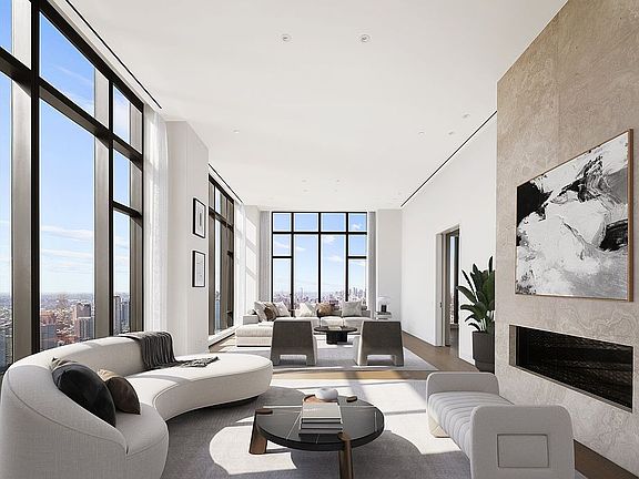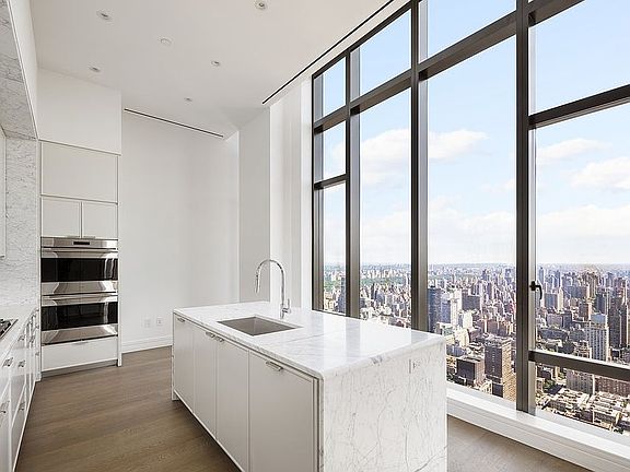 Commanding an entire floor, Penthouse 72 at Sutton Tower offers a truly breathtaking vantage point with uninterrupted 360-degree views of New York City’s skyline, rivers, and iconic landmarks. Designed by renowned architect Thomas Juul-Hansen, this sprawling 4,765-square-foot residence features 4 bedrooms and 4.5 baths, with every room oriented to maximize light, space, and the city’s ever-changing vistas. Direct elevator access opens into a dramatic great room with soaring 15-foot ceilings and southeastern exposure, framed by floor-to-ceiling windows that flood the space with natural light. The north-facing kitchen is a showpiece, featuring a Statuarietto marble island, Italian matte lacquer cabinetry, and a full suite of Sub-Zero and Wolf appliances, seamlessly connected to a formal dining room with sweeping northeastern views.