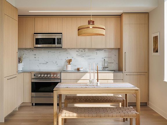 This exceptional Corner 1 Bedroom, 1 Bathroom residence boasts southern and western exposure, featuring an open kitchen with custom natural oak cabinetry, quartz countertops, Italian Statuary Marble tile backsplashes, and top-tier Fisher Paykel appliances. Five-inch wide plank LVT flooring extends beneath floor-to-ceiling corner windows, flooding the living spaces with natural light. The luxurious bathroom includes a custom Italian vanity with ample storage, a Calacatta quartz countertop, and a bathtub. Additional amenities include solar shades in the living areas and a stacked washer/dryer.