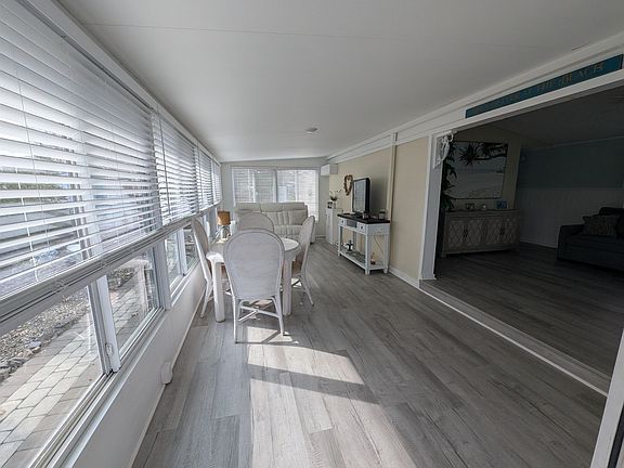 Fantastic unit that has tons of upgrades to it! Enter into the Florida room with tons of natural light and your large opening into main unit. Vinyl flooring thruout, large open kitchen with shabby chic decor and large eat in counter and new countertop. Venture down the hallway to the second Bedroom with stackable washer and dryer (can be moved to hallway if necessary) Great size bathroom with large vanity and ample shower. Primary has a large closet with built in mirrored doors. Nice new slider with deck. Outside has massive paver walkway and patio, with large shed. Temporary fence surrounds area. Parking in front and rear of property. Move in ready!