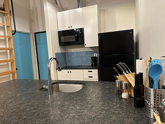 This studio unit has a King bed, 1 bathroom, and a computer loft. All furnishings shown in the photos are included in the rent. The 18' ceilings make the unit feel very spacious.