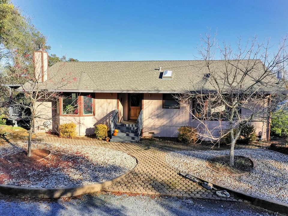 Oh, my goodness, what a special home on over 6 plus awesome acres. It is perched on a hilltop with an amazing view and privacy galore. The open floorplan, with beautiful, engineered maple flooring is stunning. If it's a lot of natural light you're looking for then look no further. Beautiful wood framed windows and sliding glass doors and ample skylights make it feel like you're in a treehouse. Cozy up on the window seat, in the living room, with your favorite book and cup of tea by the gas log fireplace and let the stress of the day disappear. This 2 bedroom and 2-bathroom 1700 square foot home has an additional 400 square foot studio/office, with full bath, separate from the house. A large deck, partially covered, allows year-round outdoor entertainment. There is a fenced veggie garden with a small greenhouse and covered RV parking. Just a couple of minutes to Coloma/Lotus and the American River and a super school district.
