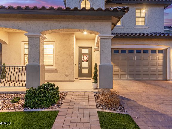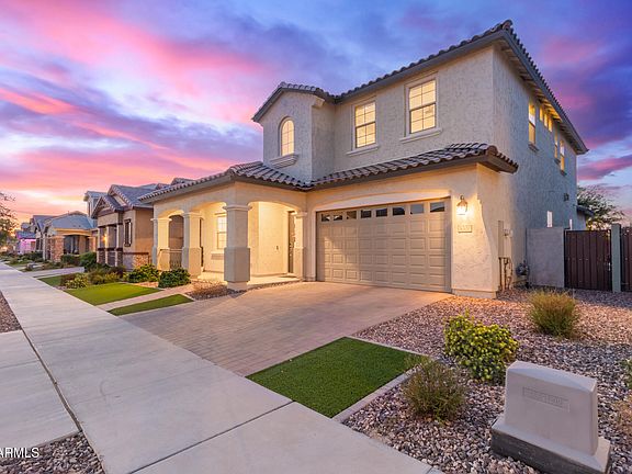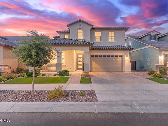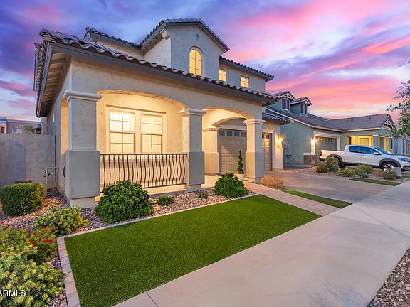 Your DREAM home with POOL is here in Cooley Station! This gorgeous two-story residence offers 4 beds, 3 baths, & a 3-car garage. The great curb appeal is highlighted by a mature landscape w/artificial turf, paver driveway & pathway, and a relaxing front porch. The interior exudes elegance throughout with stylish light fixtures, tall ceilings, neutral palette, abundant natural light, and tasteful flooring - soft carpet & wood-look tile in all the right places. You'll love the seamlessly flowing open layout paired with a cozy fireplace and multi-sliding doors merging the inside & outside activities. The gourmet kitchen is a cook's delight! Featuring high-end SS appliances w/cooktop gas, granite counters, a walk-in pantry, ample white cabinetry w/crown molding, and an island w/breakfast bar. Need extra space? This beauty comes with a flex room plus a den, ideal for a home office, creative studio, playroom, or whatever fits your lifestyle! One bedroom & one bathroom complete the downstairs. Upstairs, you'll find the primary bedroom boasting an ensuite with dual sinks & a walk-in closet. Laundry room with cabinetry. But the real highlight is the backyard oasis! Experience resort-style living with a covered patio, a fire pit, well-laid travertine, synthetic lawn, and a sparkling pool w/waterfall. What's not to like? This gem has all the bells & whistles!
