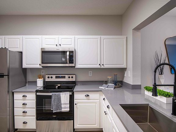 Emerald Renovation: Modern and Elegant, our Emerald renovated apartment home includes serene gray wall paint throughout with a fully upgraded lighting package and a kitchen pass-through (available in select homes). Whip up a gourmet meal in your kitchen featuring black appliances with maple shaker cabinet, Stainless Steel appliances with espresso cabinets, or Stainless-Steel appliances with white cabinets, all including Formica countertops, tile backsplash, nickel hardware, retractable kitchen faucet, and convenient USB outlets. Enjoy vinyl plank flooring in your kitchen and bathroom(s) with plush carpeting in the bedroom(s), tiled entryways (available in select units), and white 2-inch faux wood blinds.