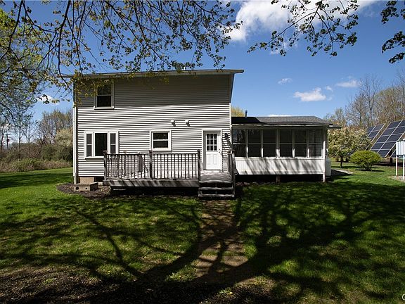 Welcome home. This totally updated colonial is waiting for you. Nestled on 2.6 acres just outside the village, this one has it all. Pool, large 2 story outbuilding, sheds. and firepit. Enjoy summer nights on the deck or in the sun porch. Tons of privacy in your park like yard. Inside, you'll enjoy the brand new kitchen and baths. First floor laundry is a bonus! Tons of natural light floods the home through large picture windows in the Living Room and Dining Room. Finished basement with gas fireplace. All new flooring throughout. 3 bedrooms and brand new bath with double sinks upstairs. Tons of closet space. Attached Garage. LOW utility bills here with Solar Panels in place. Large driveway. Lovely landscaping. See this one today!